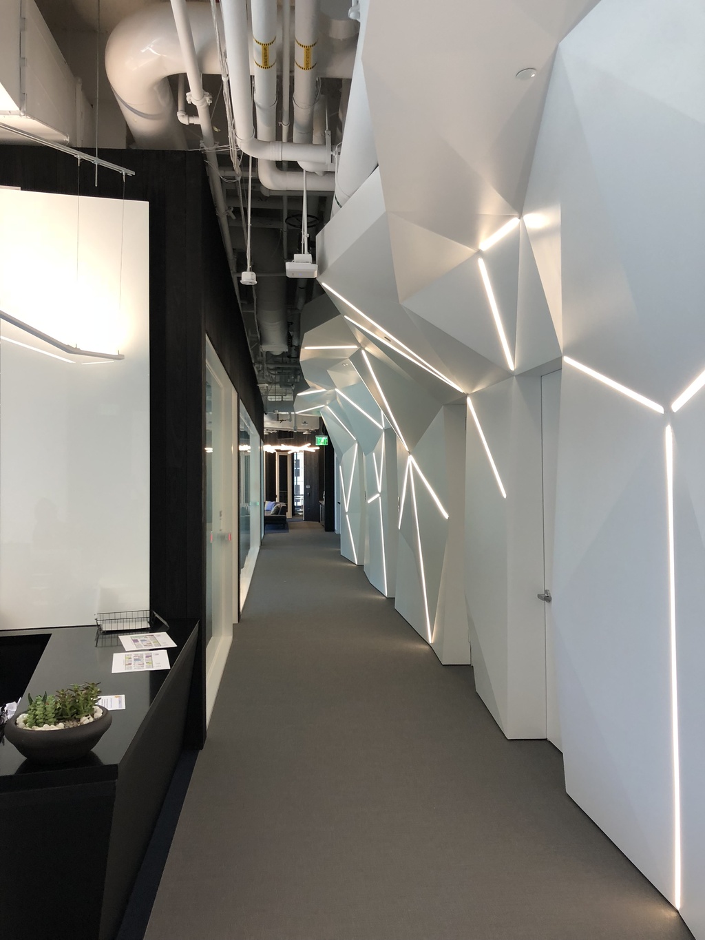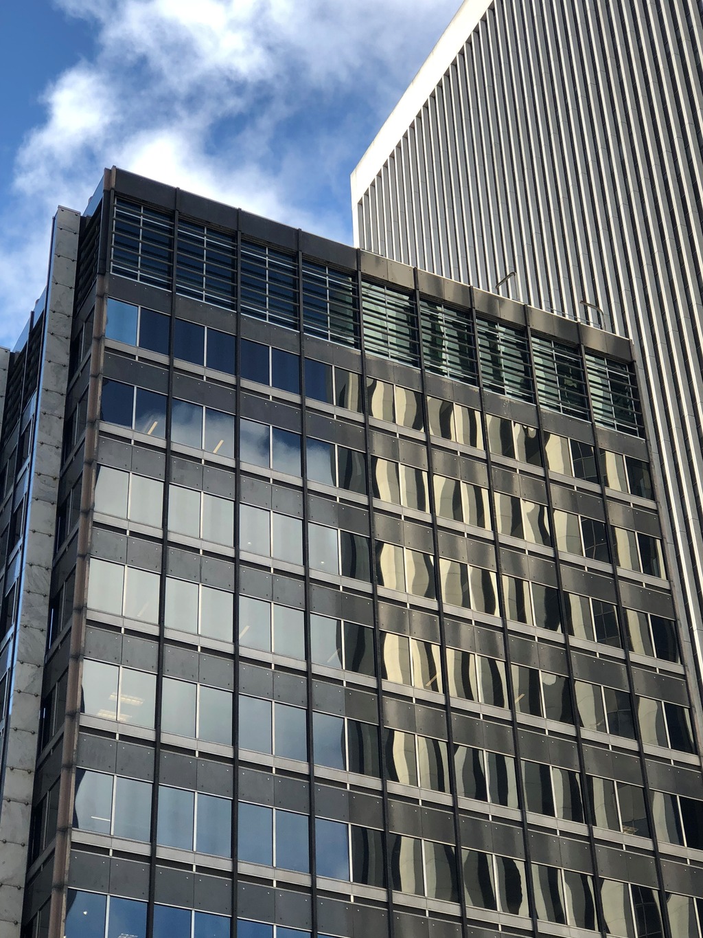 This project involved the enclosure of the mechanical roof deck, including new concrete roof and aluminum curtain walls, relocation of mechanical and elevator systems, and conversion into a new high-ceiling class-A office space. This classic mid-century modern 1959 building is a registered historic resource with the City of San Francisco due to its unique use of a stainless steel facade, which required a historic resource evaluation to be approved for the new exterior curtain wall. The configuration of the new curtain wall, including airfoil shade fins, was intended to evoke the original stainless steel louvers of the former mechanical roof deck, and the former “vice president’s rooftop penthouse apartment” was converted into a mechanical space without alteration of the original design.