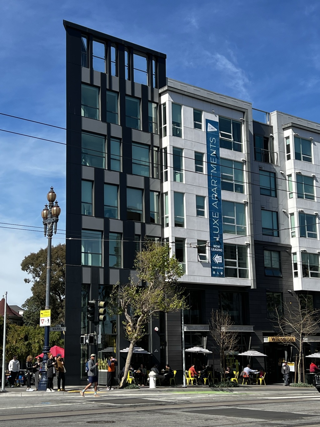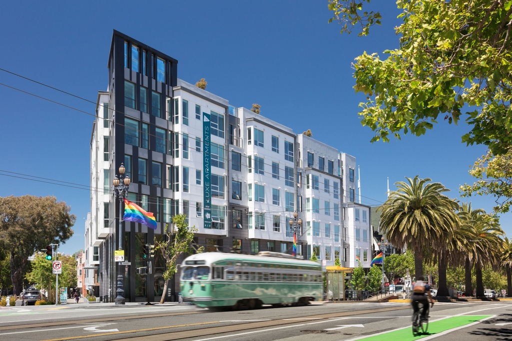 A new six-story apartment building is being constructed at a prominent location on Upper Market Street in San Francisco. The building will have five levels of Type III-A fire-resistive construction above a concrete podium. Additionally, the project will include four townhomes located on the adjacent side street.