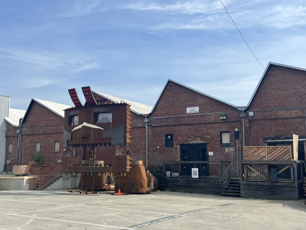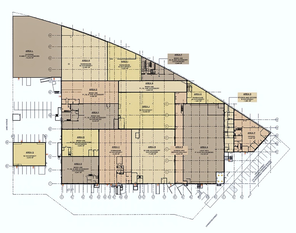 This historic brick and timber warehouse is a collection of several connected structures built over a few decades from the late 19th century to the early 20th century. It has been in need of major and minor improvements to support its use as a collection of artisans and fabricators, small manufacturing, professional offices and catering establishments. These improvements, which include evaluation, design, engineering, and construction, have unfolded over the last year, and will continue over the next few years until funds are su@icient to conduct a full-scale seismic, electrical, mechanical, plumbing, and life safety upgrade. Chiral Design Build has been instrumental in advancing those designs and developing visions as collateral for fundraising purposes.